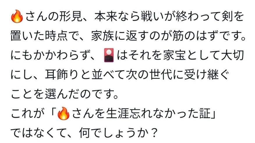 🔥씨의 유품, 본래라면 싸움이 끝나고 검을 놓은 시점에서, 가족에게 돌려주는 것이 이치일 것입니다. 그럼에도 불구하고, 탄지로🎴는 그것을 가보로서 소중히 하고, 귀걸이와 나란히 다음 세대에 계승하는 것을 선택한 것입니다.
